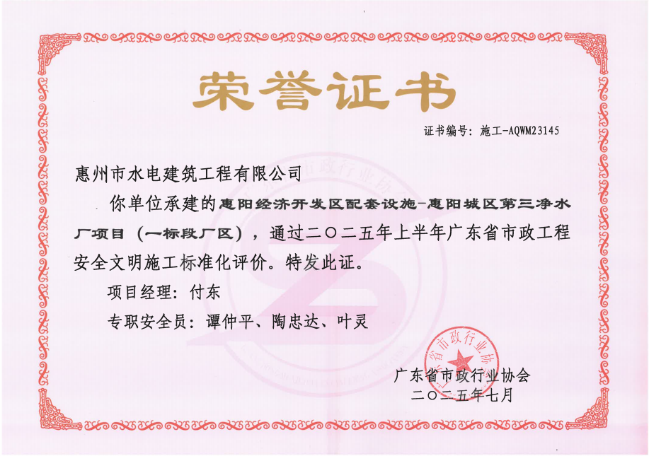 惠州市水電建筑工程有限公司成立于一九六四年四月,隸屬惠州市水務(wù)集團(tuán)有限公司,是一家國(guó)有綜合性施工企業(yè),主營(yíng)水利水電工程、房屋建筑、市政工程等施工業(yè)務(wù)。公司擁有水利水電工程施工總承包一級(jí)、建筑工程施工總承包一級(jí)、市政公用工程施工總承包一級(jí)、公路工程施工總承包三級(jí),公路路基、路面及建筑裝修裝飾專業(yè)承包二級(jí),環(huán)保工程、機(jī)電安裝、河湖整治、輸變電工程專業(yè)承包三級(jí)等經(jīng)營(yíng)資質(zhì)……